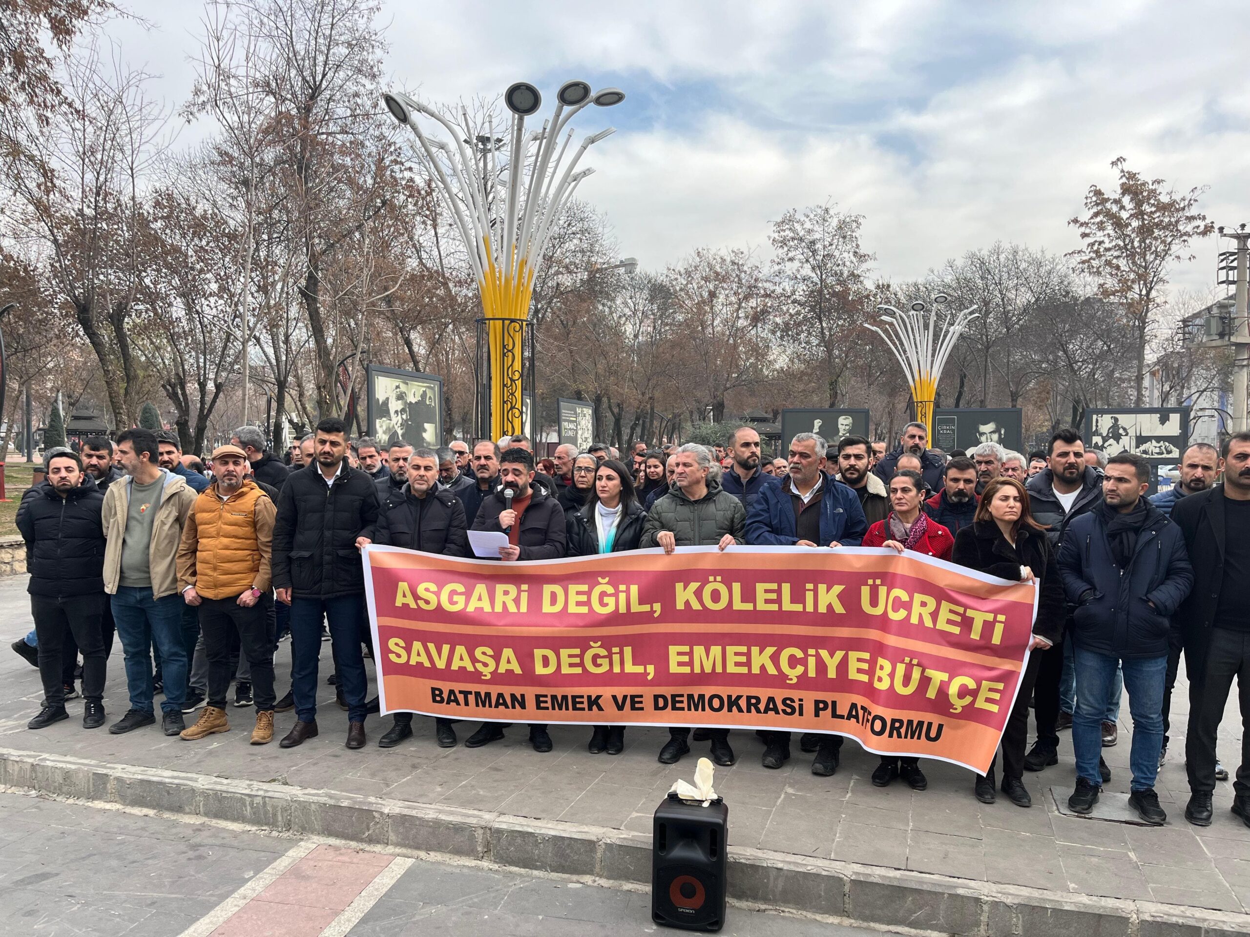 Yılmaz Güney Parkında yapılan basın açıklamasını platform adına okuyan Petrol-İş Batman Şube Başkanı Veysel Kartal: ‘’Asgari ücreti çocuklarına harçlık diye verenler, çocuklarına harçlık veremeyecek hale getirdikleri milyonların 2025 yılında alacağı asgari ücretin 22 bin 104 TL olmasına karar verdi. İşverenlerin ve sermayenin menfaatlerini gözeten bir asgari ücret rakamı yine tek taraflı olarak belirlenmiş ve bu karar verilirken işçinin geçim şartları dikkate alınmamıştır’’ dedi.