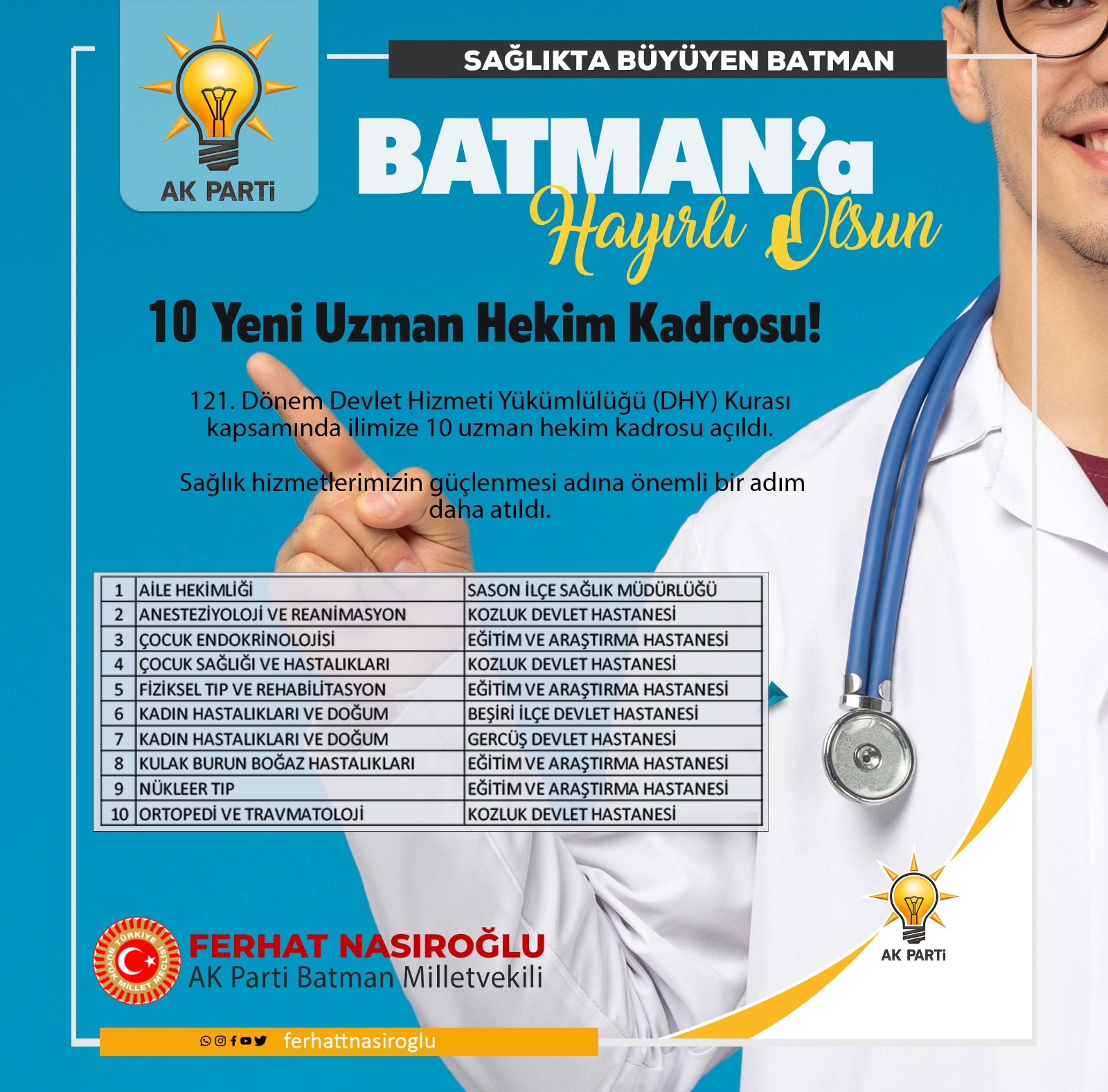Nasıroğlu, hastanelerde eksik olan branşlara yeni doktor kadrolarının açılmasından dolayı teşekkürlerini ileterek şu ifadeleri kullandı: “Cumhurbaşkanımız Sayın Recep Tayyip Erdoğan ve Sağlık Bakanımız Sayın Prof. Dr. Kemal Memişoğlu’na, Batman’a gösterdikleri özel ilgi ve desteklerinden dolayı hemşehrilerimiz adına teşekkür ediyorum. Açılan yeni kadrolarla Batman’daki sağlık hizmetleri daha da güçlenecek ve vatandaşlarımız sağlık hizmetlerine daha kolay erişebilecek.”