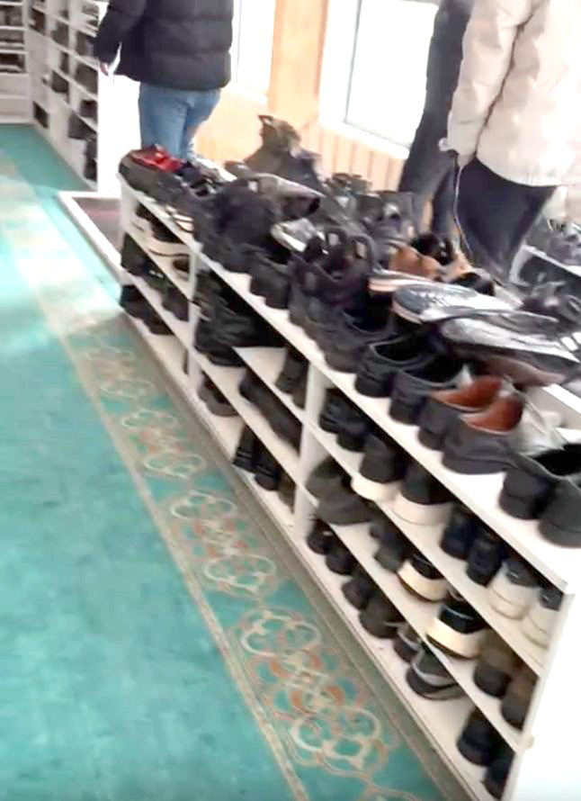 Ayakkabıdan damlayan pis sular cami halısına akıyor.