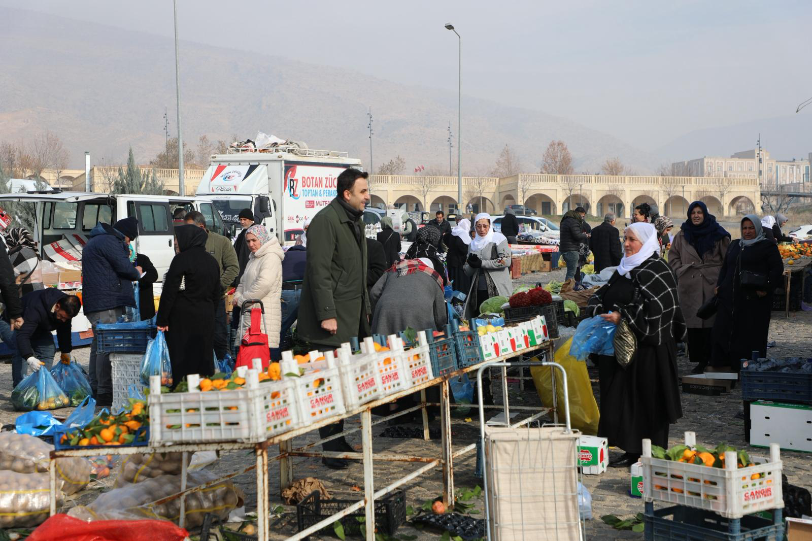 Soğuk hava şartlarına rağmen tezgâhlarını açarak ilçeye hizmet sunan pazarcılara teşekkür eden Kaymakam İmrak, esnafın talep ve ihtiyaçlarını dinledi.