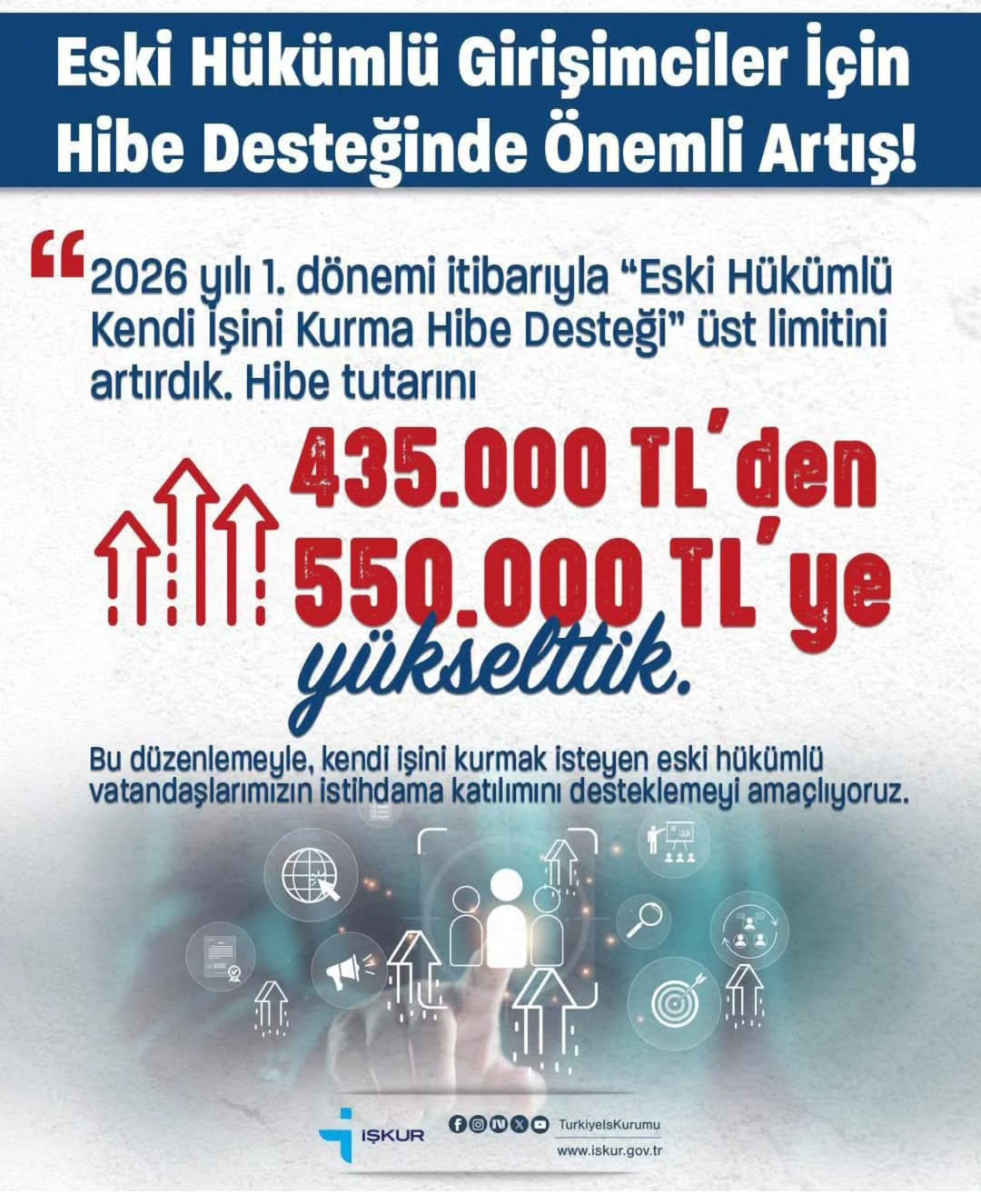 Türkiye İş Kurumu (İŞKUR), engelli bireyler ile eski hükümlülerin istihdama kazandırılması ve kendi işlerini kurmalarının desteklenmesi amacıyla 2026/1. Dönem hibe destek programı başvurularını başlattı.