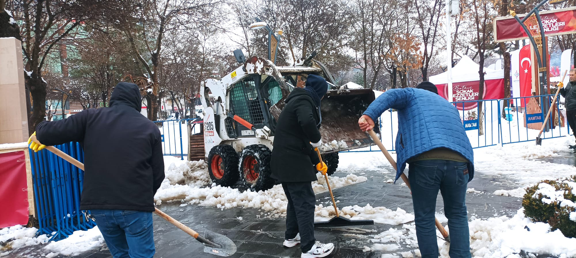 Büyük iş makinelerinin giremediği dar sokaklar, apartman girişleri ve mahalle içi kaldırımlarda ise mini iş makineleri, bobcatler ve el kürekleriyle çalışmalar devam ediyor.