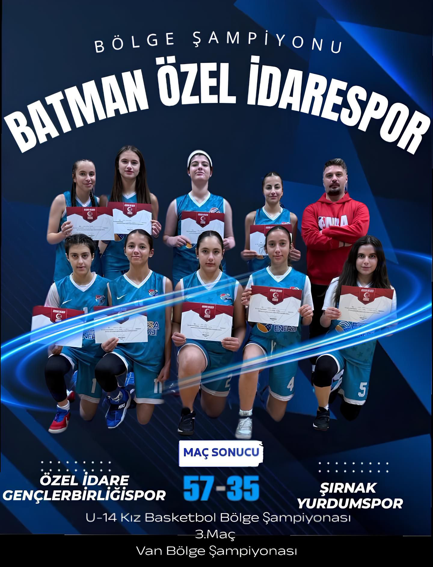 Van’da 03–05 Şubat tarihleri arasında düzenlenen U-14 Kız Basketbol Bölge Şampiyonası’nda Batman Özel İdare Gençlerbirliği Spor önemli bir başarıya imza attı. Turnuva boyunca etkili bir performans sergileyen Batman temsilcisi, tüm karşılaşmalarını kazanarak şampiyonayı namağlup tamamladı.